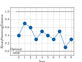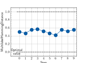 \[\text{Hamming distance} = \frac{1}{N \cdot L} \sum_i^N \sum_l^L 1(y_{il} \neq \hat{y}_{il})\]Where \(y\) is a tensor of target values, \(\hat{y}\) is a tensor of predictions, and \(\bullet_{il}\) refers to the \(l\)-th label of the \(i\)-th sample of that tensor.