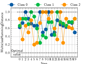 >>> # Example plotting a single value per class >>> from torch import randint >>> from torchmetrics.classification import MulticlassHammingDistance >>> metric = MulticlassHammingDistance(num_classes=3, average=None) >>> metric.update(randint(3, (20,)), randint(3, (20,))) >>> fig_, ax_ = metric.plot()