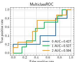 >>> from torch import randn, randint >>> from torchmetrics.classification import MulticlassROC >>> preds = randn(20, 3).softmax(dim=-1) >>> target = randint(3, (20,)) >>> metric = MulticlassROC(num_classes=3) >>> metric.update(preds, target) >>> fig_, ax_ = metric.plot(score=True)