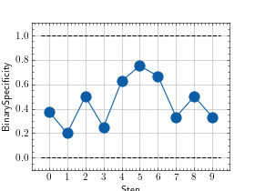 >>> from torch import rand, randint >>> # Example plotting multiple values >>> from torchmetrics.classification import BinarySpecificity >>> metric = BinarySpecificity() >>> values = [ ] >>> for _ in range(10): ... values.append(metric(rand(10), randint(2,(10,)))) >>> fig_, ax_ = metric.plot(values)