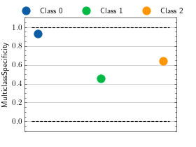 >>> from torch import randint >>> # Example plotting a single value per class >>> from torchmetrics.classification import MulticlassSpecificity >>> metric = MulticlassSpecificity(num_classes=3, average=None) >>> metric.update(randint(3, (20,)), randint(3, (20,))) >>> fig_, ax_ = metric.plot()