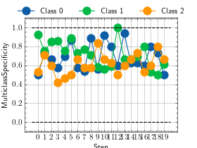 >>> from torch import rand, randint >>> # Example plotting multiple values >>> from torchmetrics.classification import MultilabelSpecificity >>> metric = MultilabelSpecificity(num_labels=3) >>> values = [ ] >>> for _ in range(10): ... values.append(metric(randint(2, (20, 3)), randint(2, (20, 3)))) >>> fig_, ax_ = metric.plot(values)