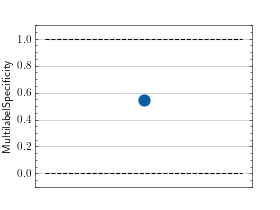 >>> from torch import tensor >>> from torchmetrics.classification import MultilabelSpecificity >>> target = tensor([[0, 1, 0], [1, 0, 1]]) >>> preds = tensor([[0, 0, 1], [1, 0, 1]]) >>> metric = MultilabelSpecificity(num_labels=3) >>> metric(preds, target) tensor(0.6667) >>> mls = MultilabelSpecificity(num_labels=3, average=None) >>> mls(preds, target) tensor([1., 1., 0.])