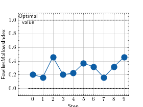 >>> # Example plotting multiple values >>> import torch >>> from torchmetrics.clustering import FowlkesMallowsIndex >>> metric = FowlkesMallowsIndex() >>> values = [ ] >>> for _ in range(10): ... values.append(metric(torch.randint(0, 4, (10,)), torch.randint(0, 4, (10,)))) >>> fig_, ax_ = metric.plot(values)